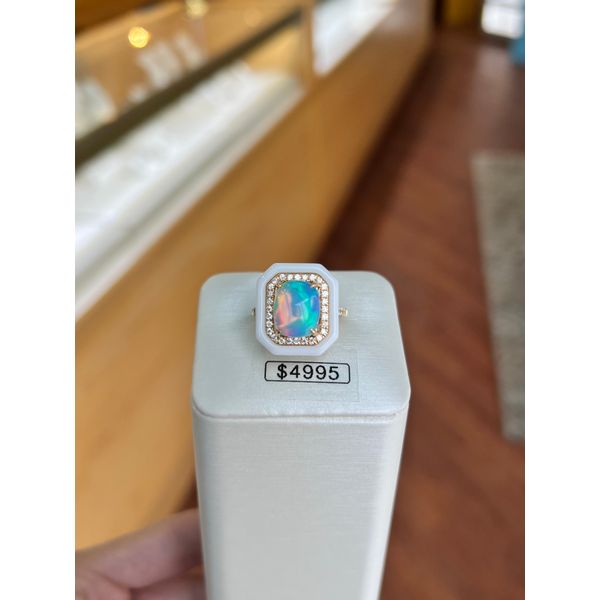 (315) 253-700014K Yellow Gold Opal and Diamond Ring with White Enamel Frame