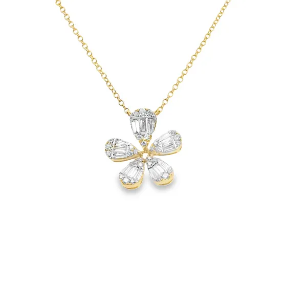 (315) 253-700014K Yellow Baguette and Round Diamond Flower Pendant with Adjustable Chain .44CTW