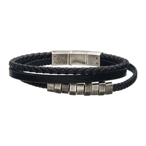 (315) 253-7000Stainless and Leather Triple Row Bracelet
