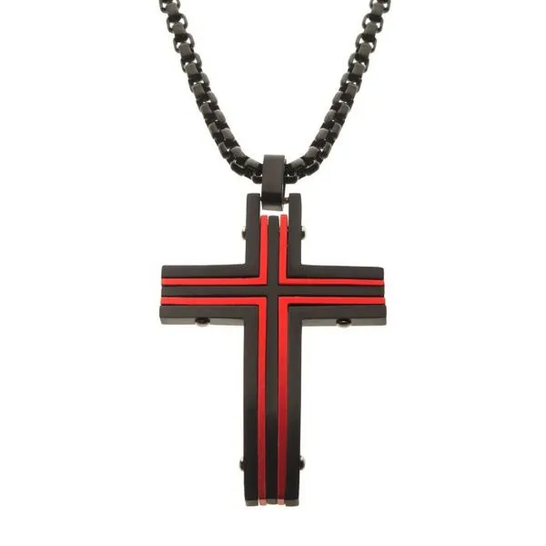 (315) 253-7000Stainless Steel Black & Red Plated Dante Cross Pendant with 24 Inch Black Plated Bold Round Box Chain